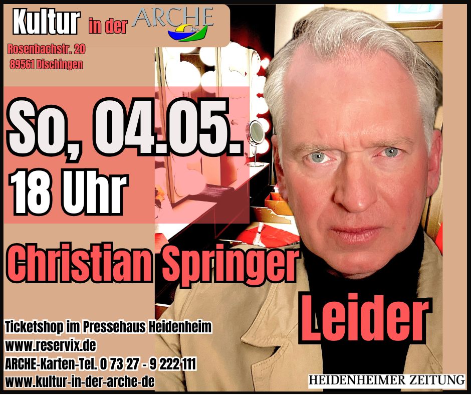Christian Springers kabarettistisches Schaffen bedient Herz und Hirn des Publikums. Zwischen den Zeilen seiner Solo-Programme liest man seine Botschaft für Toleranz und Mitmenschlichkeit, eingebettet in absurden Witz und skurrilem Biographischen.